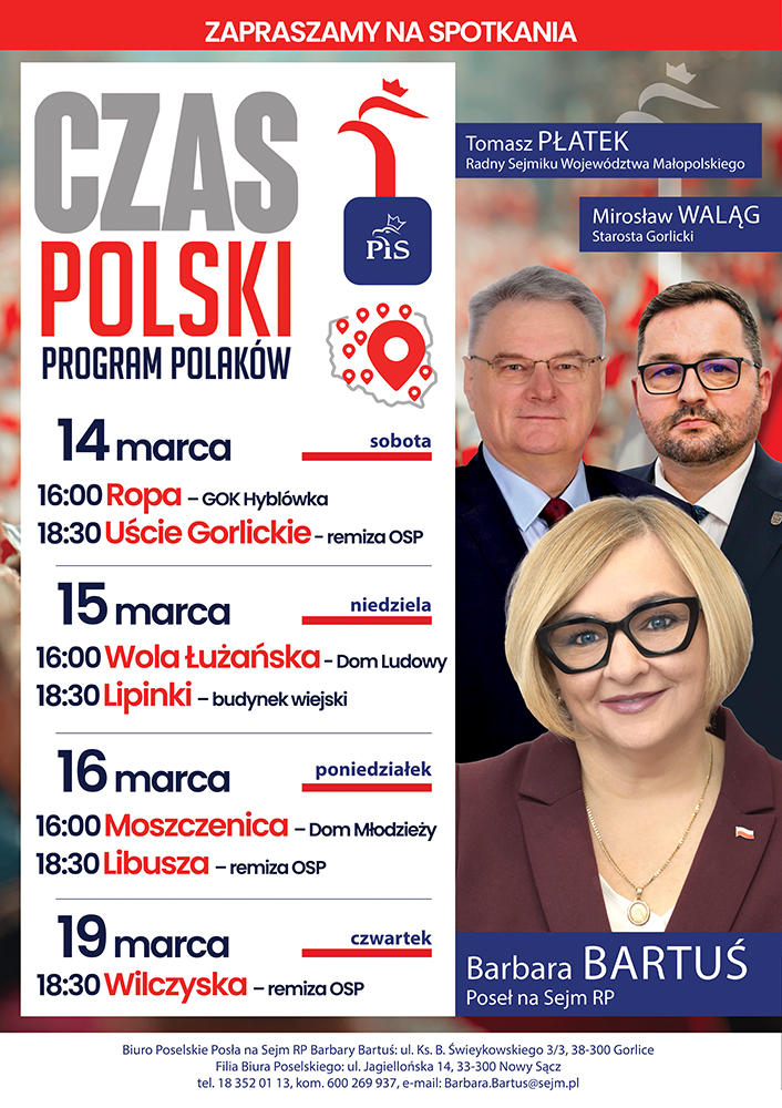 Poseł na Sejm RP Barbara Bartuś wzięła udział w XII Przeglądzie Dorobku Kół Gospodyń Wiejskich Gminy Grybów, który odbył się w miejscowości Polna. Wydarzenie zgromadziło Koła Gospodyń Wiejskich z terenu Gminy i było okazją do zaprezentowania bogactwa lokalnych tradycji, regionalnej kuchni oraz twórczości rękodzielniczej.